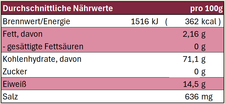 Nutritional table