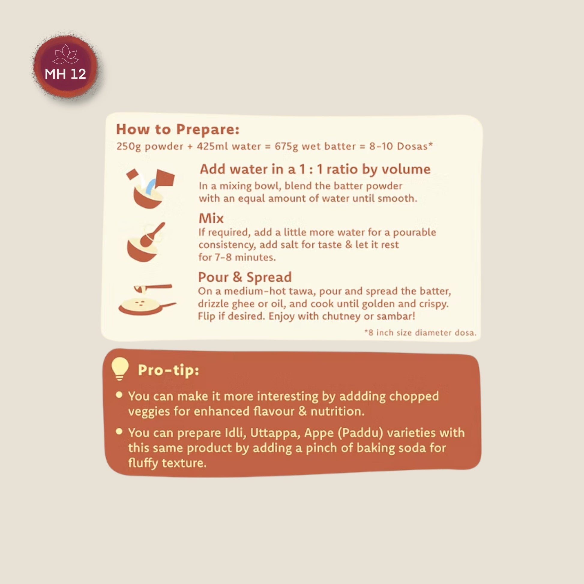 250 g powder + 425 ml water = 675 g finished dough = 8-10 dosas*